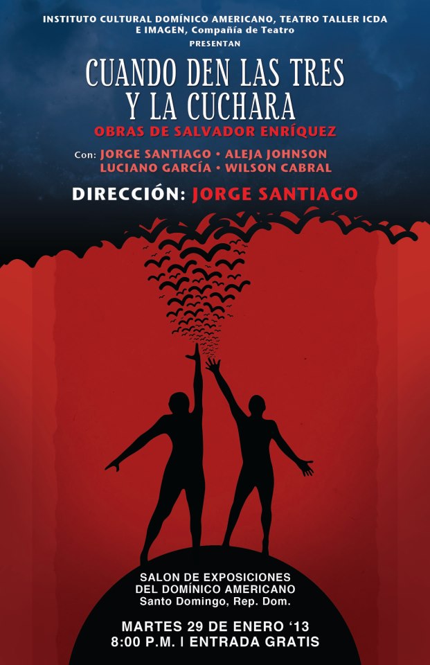 El Teatro Taller del Instituto Cultural Dominico Americano e IMAGEN, Compañia de Teatro invitan a la puesta en escena de la obra «Cuando den las tres y la cuchara» de Salvador Enríquez, dirigida por Jorge Santiago quien también actua junto a Aleja Johnson, Luciano García y Wilson Cabral.